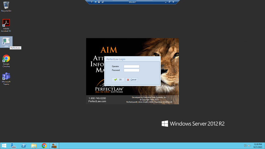 When the remote desktop connection is open, you should see a screen similar to this one. You can double-click the "AIM" shortcut on the desktop to open the PerfectLaw interface, and use this as you would when in the office.