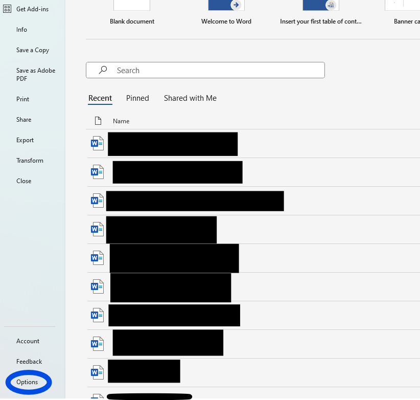 - Open Word, go to File, click "Options" on the bottom left hand corner of your screen