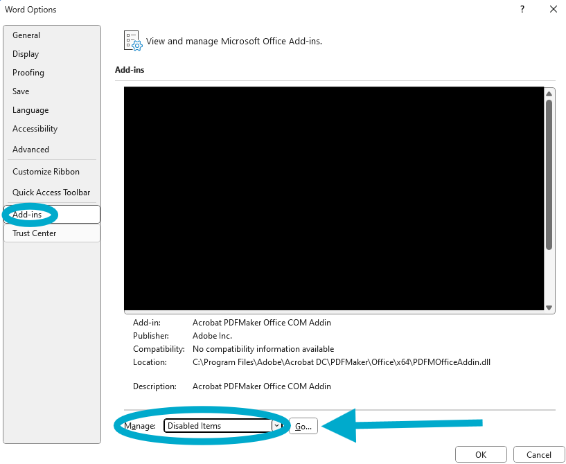 - When in Options, then go to "Add-ins" select the drop-down menu and select "disabled items" then hit "Go..." to see all disabled items. (NOTE: To open the drop down menu, hit the " ˇ " button by where it says "COM Add-ins" on your screen)